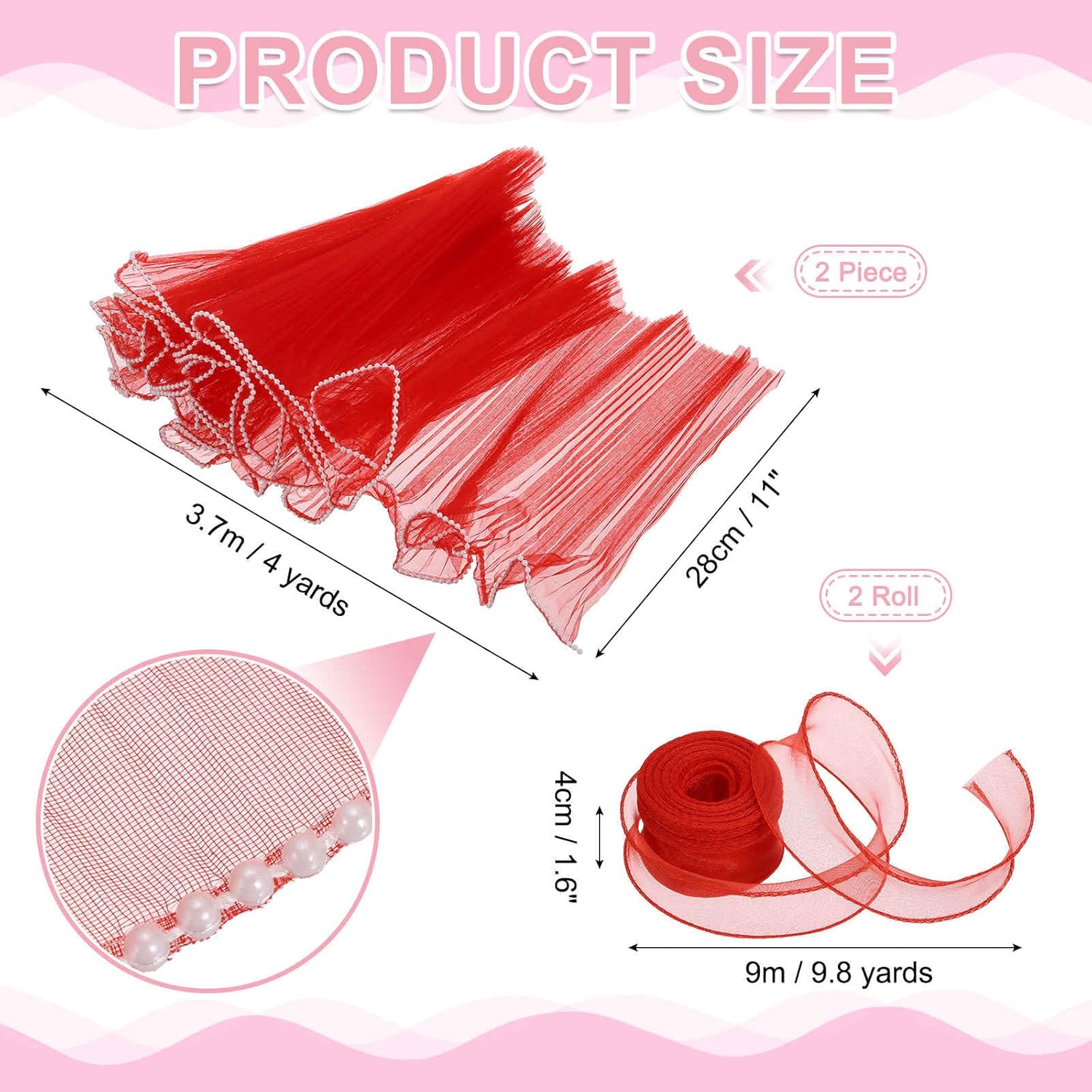 What is this?This pearl-edged floral wrapping paper, crafted from polyester mesh, is designed for wrapping bouquets, gifts, and items like leather, cosmetics, and daily necessities, suitable for weddings, anniversaries, birthdays, Mother's Day, Valentine's Day, crafts, and home decor, elevating any occasion with its elegant presentation.What will I get?The flower paper wrap bags we provide here are in the size of:Flower packing paper size: 3.7mx28cm/4 yards x 11 inches;Ribbon Size: 9mx4cm/9.8 yards x 1.6 inch;Color: Bright Red;Material: mesh fabric;Packing List: 2 piece of flower wrapping paper, 2 roll of tulle ribbon.Are there any advantages of the product?Good-quality Material: The flower wrapping paper is made of good-quality mesh fabric, soft, smooth, with elastic, waterproof properties, ensuring durability and flexibility. French-style wavy lace with elastic pleats and lustrous pearl beads edge adds sophistication.Versatile Use: Designed with translucent mesh with pearl edges creates a delicate and elegant look for floral arrangements, the bouquet floral packaging paper is suitable for flowers, gifts, crafts, cakes, and decor, transforming ordinary items into exquisite presentations. Enhance your floral crafts with beautiful organza ribbon, adding a touch of elegance.How to use it?Wrap the florist pearl mesh around bouquets or gifts, securing with the included ribbon. Cut to size for crafts, cake decoration, or home decor. The stretchable material allows easy shaping around objects, while the pearl edges add a finishing touch.What should I notice?Colors may vary slightly due to lighting; please refer to the real product for details.